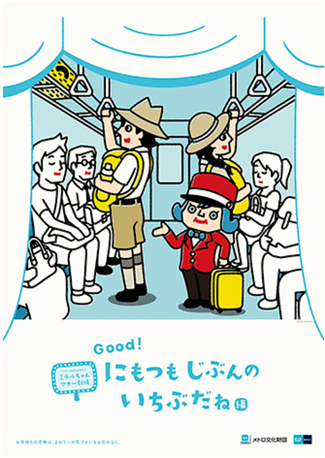 Num esforço para educar continuamente sua população e quaisquer usuários da rede, o metrô de Tokyo divulga cartazes de etiqueta desde 1974, trocando-os mensalmente. A idéia é melhorar o serviço constantemente e promover a melhor experiência possível aos passageiros.